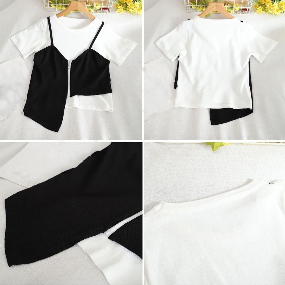 一枚でスタイリングがオシャレにきまるキャミソール付きのアシンメトリーデザインのドッキングニットTシャツ