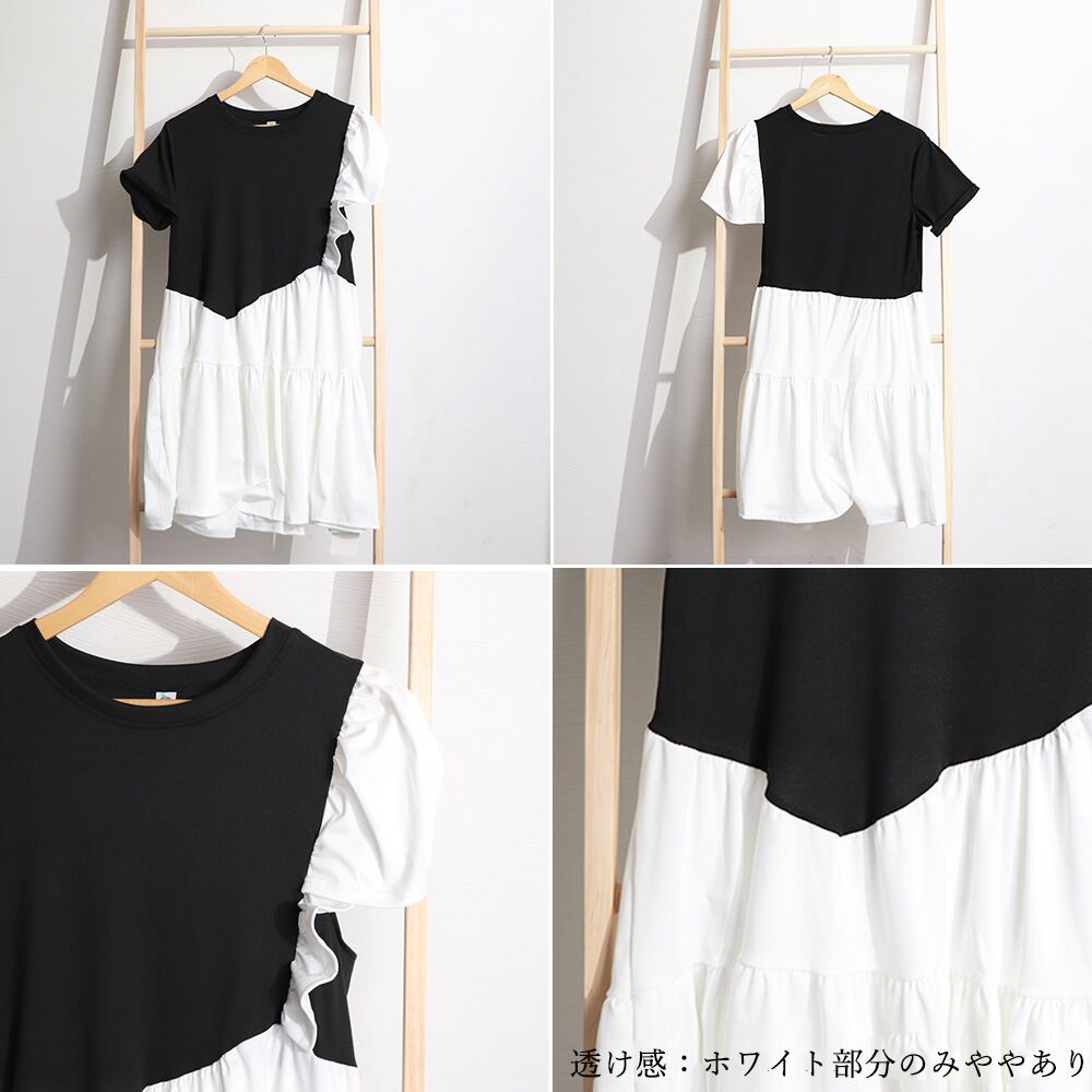 レディース 夏 可愛い ルーズドールスカート 韓国ファッション きれいめ タックワンピース夏 ゆったり ワンピ ボリュームパフスリーブは手首をスラっと細くみせてくれるミニワンピース 歩くたびに揺れるたっぷりとした裾が魅力的、さらっとした肌触りの生地で、涼しく快適な着用感 スニーカーなどのカジュアルなアイテムと合せやすくて、どんなシーンにも活躍できるアイテム 素材:ポリエステル70%+綿30% カラー:ブラック*ホワイト サイズ:XL/XXL [XL]総丈:約84cm 肩幅:約36cm 袖丈:約20cm ゆき:約38cm 身幅:約36cm 胸囲:約72-102cm ウエスト:約100-130cm ヒップ:約140cm [XXL]総丈:約86cm 肩幅:約38cm 袖丈:約22cm ゆき:約41cm 身幅:約38cm 胸囲:約76-106cm ウエスト:約110-140cm ヒップ:約150cm 裏地:なし 伸縮性:あり 透け感:ホワイト部分のみややあり 生産国:中国 ※すべて平置きサイズです(採寸方法違いより、多少の誤差がございますので、ご了承ください)。 ※海外輸入品のため、商品の細部仕様は多少異なる場合がございます。予めご了承の上、ご注文お願い致します。