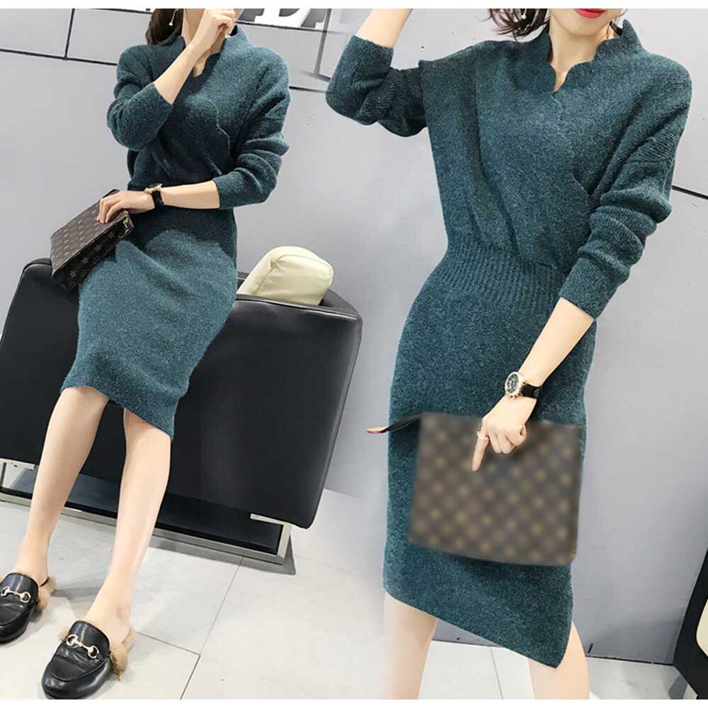 ニットワンピース vネック ワンピース 秋冬 膝丈 タイト ワンピ ミディアム