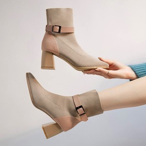 おしゃれ ソックス風 ストレッチブーツ ポインテッドトゥ ハーフブーツ 履きやすい チャンキーヒール ブーティ 痛くない ヒールブーツ 韓国 ミドルブーツ 秋冬 ベルト美脚シューズ