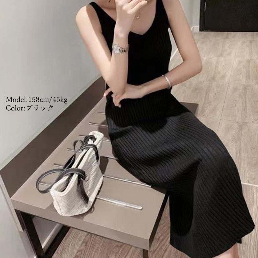 ざっくり開いたVネックが女性らしいシルエットにしてくれるシンプルなニットキャミソールワンピース