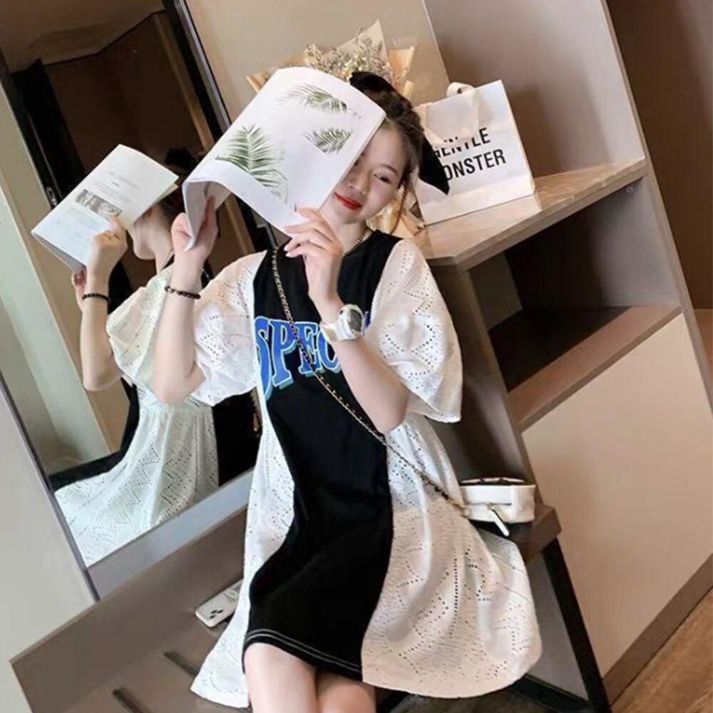ミニワンピース レース切り替え aラインワンピ 半袖 春夏 パフスリーブ tシャツワンピース カジュアル 体型カバー