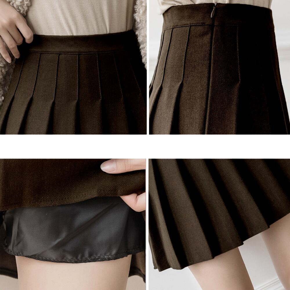 生地は見ためウール調で、裏地は柔らかくてさらりとした素材で着心地も快適のミニプリーツスカート