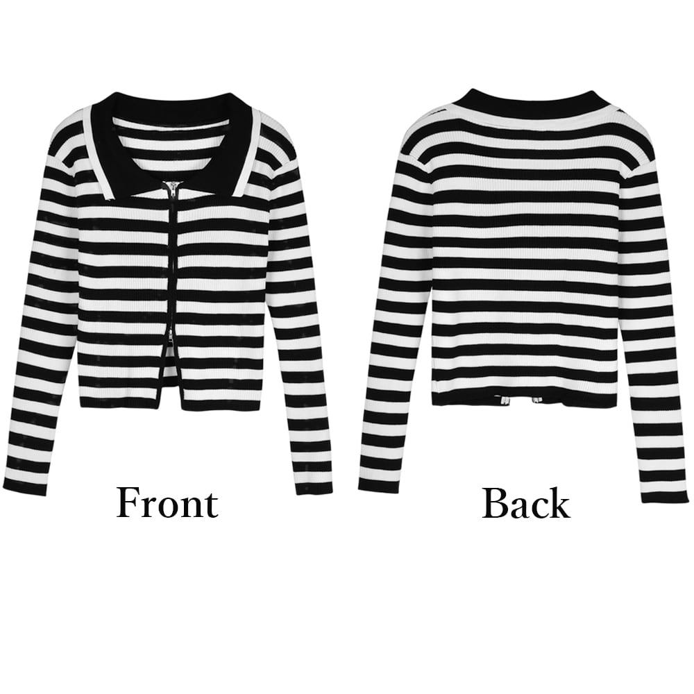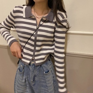 フルジップアップのクロップド丈リブボーダー柄ニットカーディガン