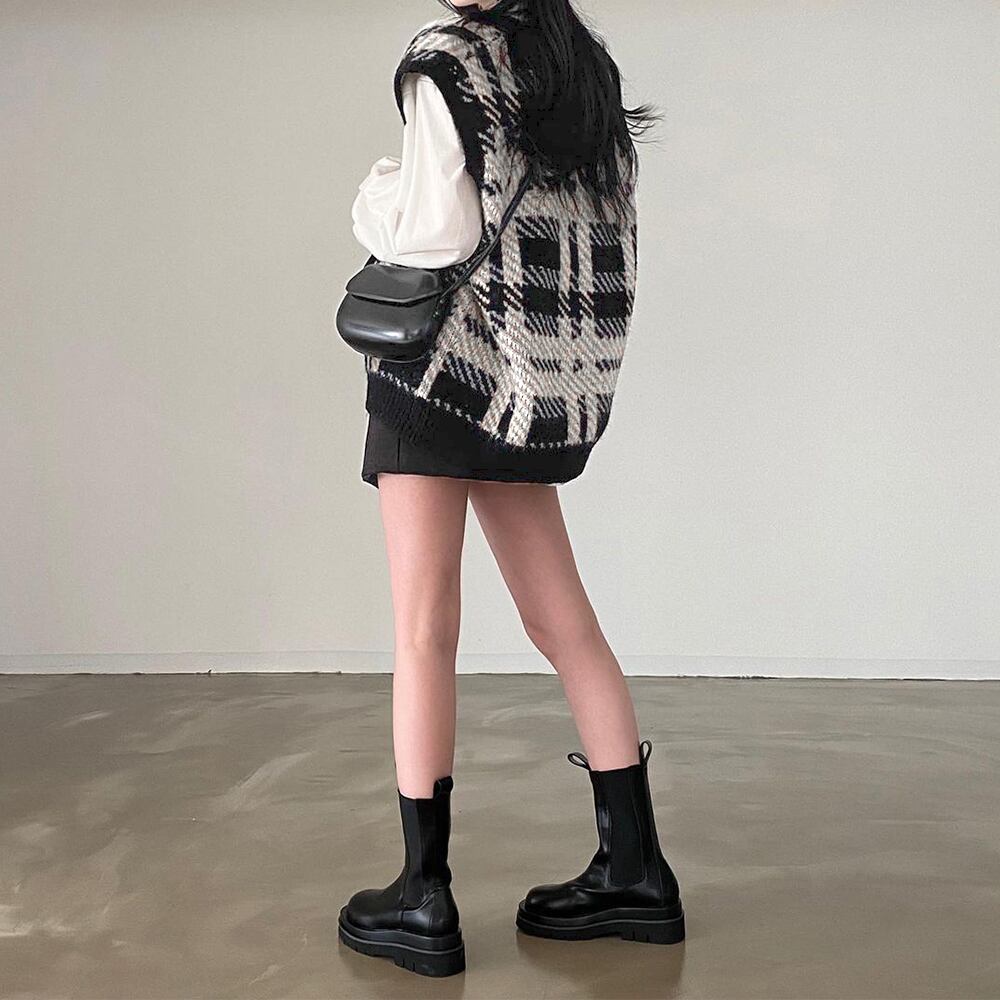 韓国風 チェック柄ベスト ショート丈 ノースリーブ ニットトップス レイヤードベスト Vネック レトロ 20代 30代