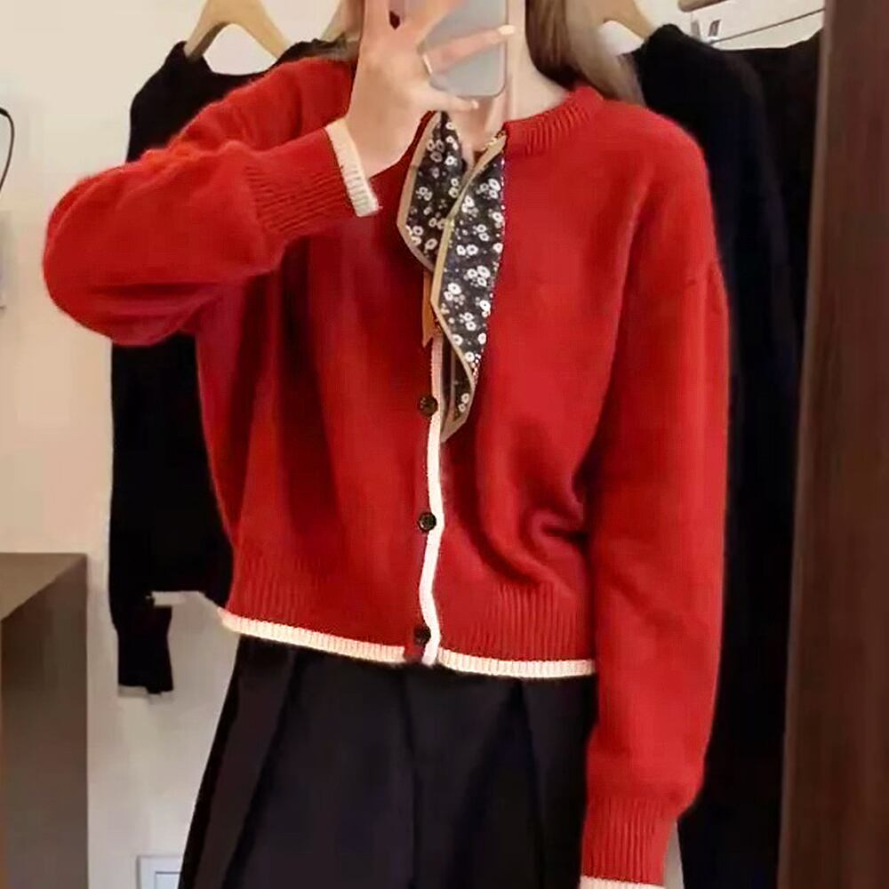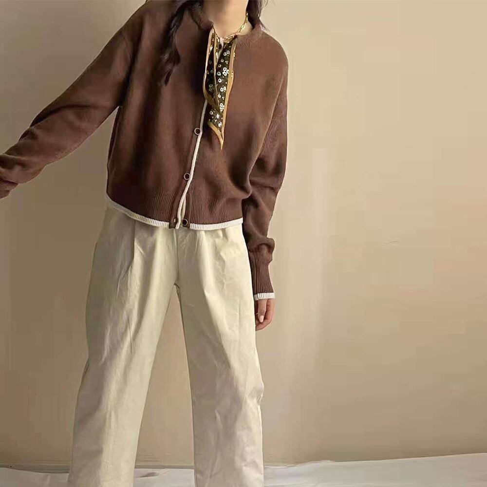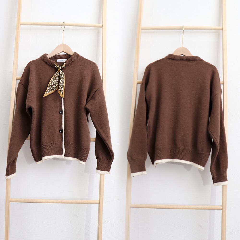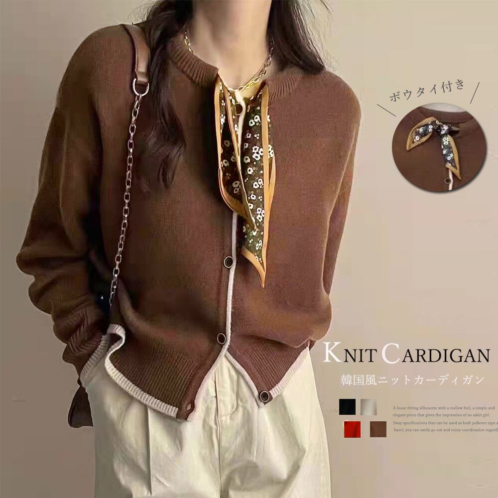 シンプルの無地生地に配色ラインを加えてボウタイスカーフをプラス、カジュアルながらも上品に仕上げたニットカーディガン