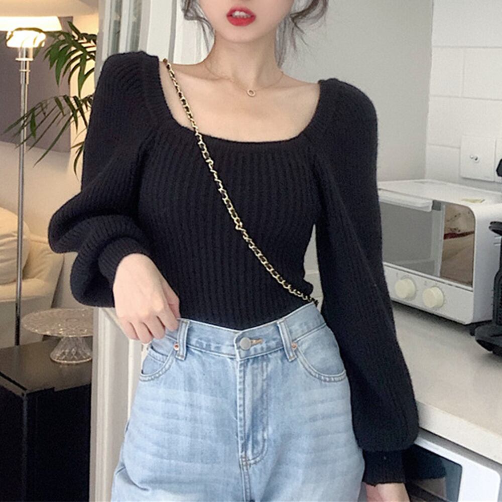 ショート丈 トップス 韓国 リブニット スクエアネック 長袖 プルオーバー ニットソー 上品 清楚 セーター 秋冬 新作