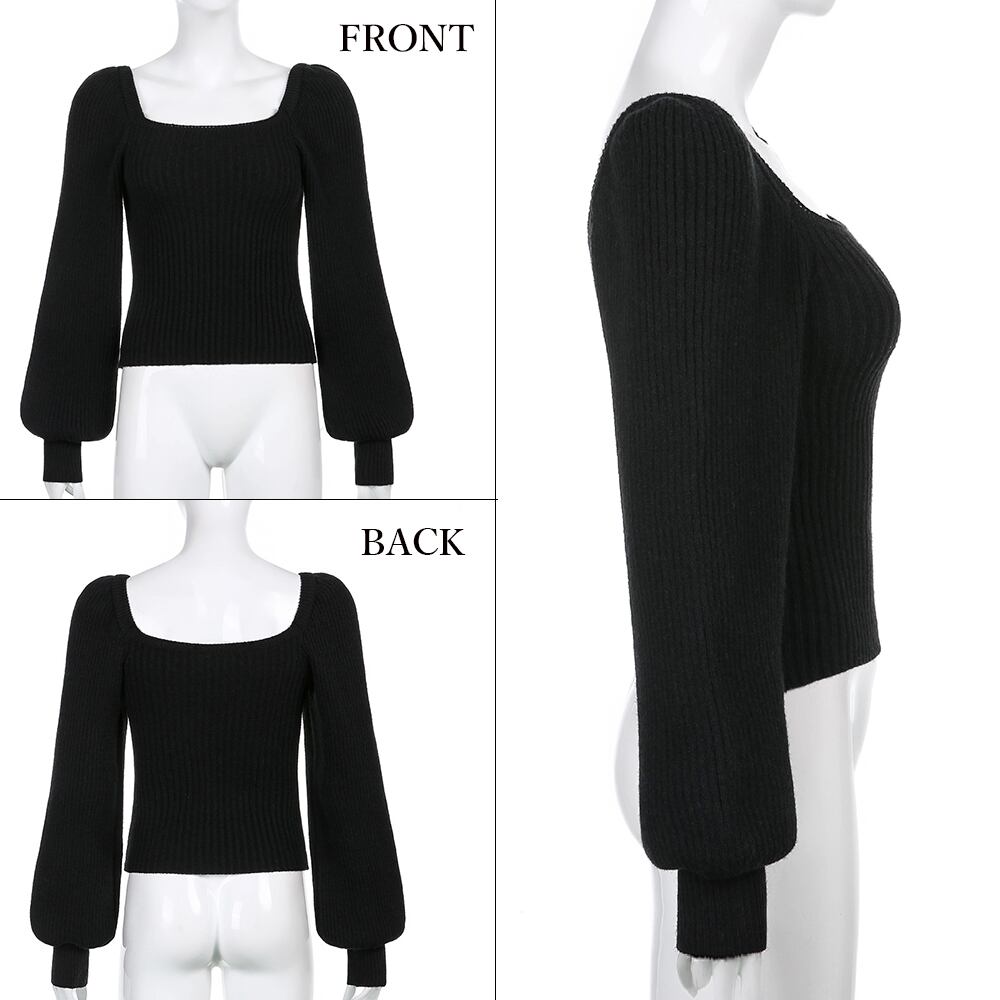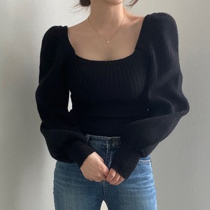 前後スクエアネックデザインでデコルテ&バックスタイルを美しく魅せ、フェミニンさを演出するパフスリーブニットトップス