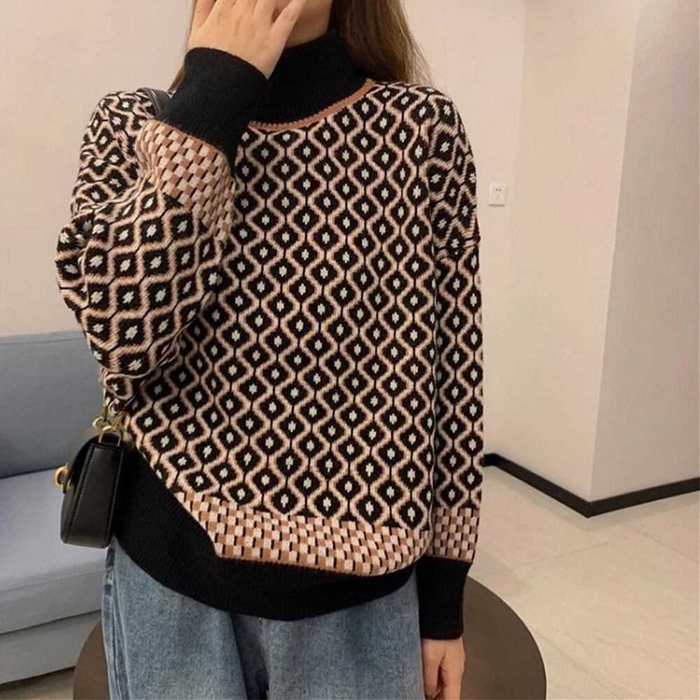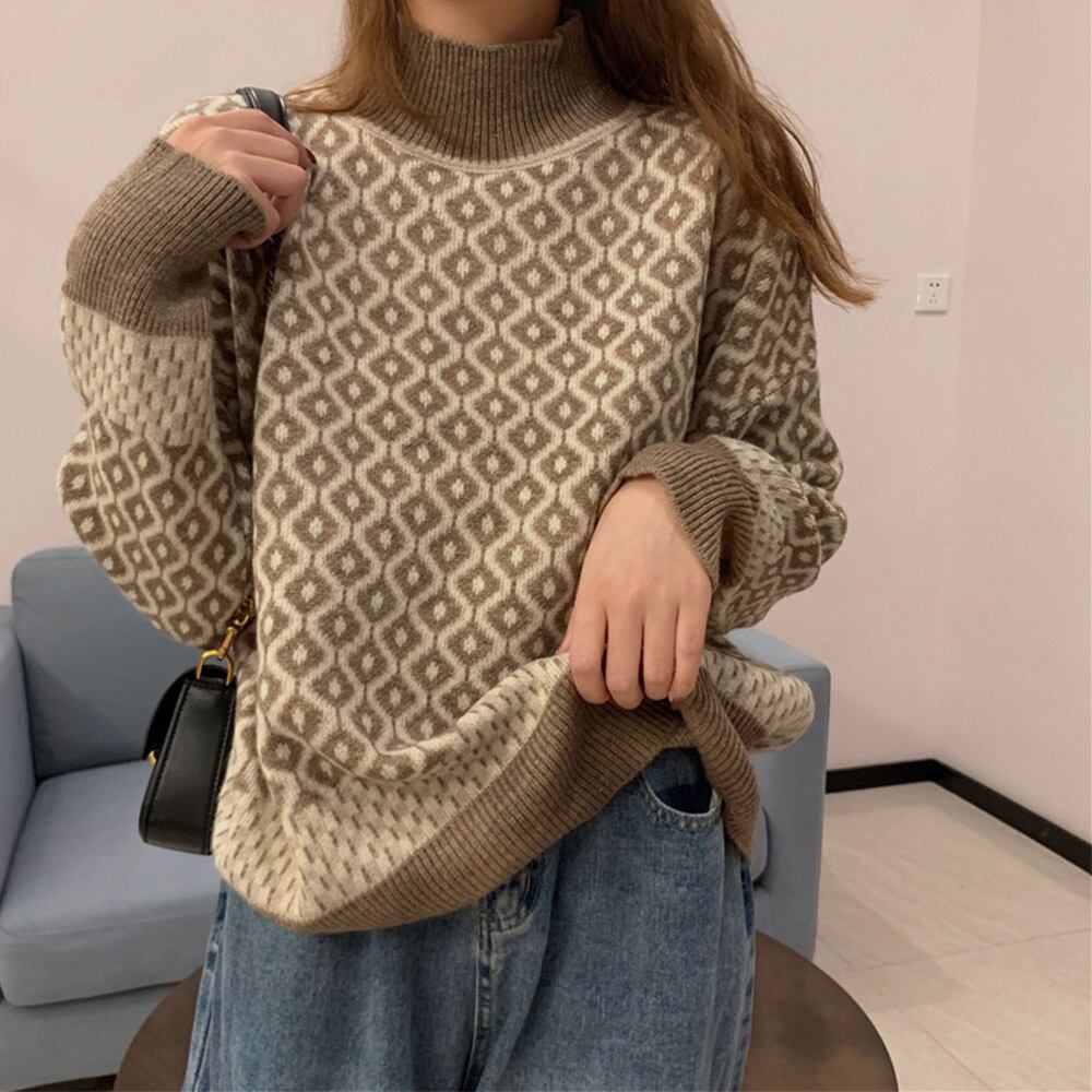 韓国風 ジャガードニット レディース 幾何学柄 長袖 タートル セーター レトロ 中肉厚 ニットプルオーバー カジュアル ド