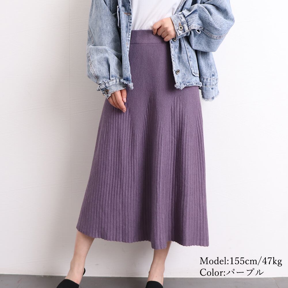 リブニットスカート 春先行 ウエストゴム フレアスカート 可愛い ミモレ丈スカート 春 暖かい ロングスカート