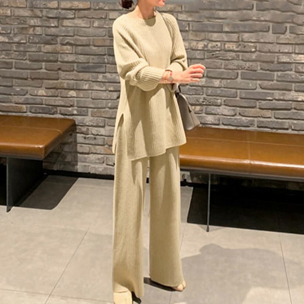 ニットアンサンブル スリット リブニットトップス 長袖 カジュアル ニットセミワイドパンツ 上下セット 30代40代