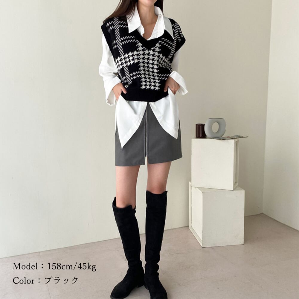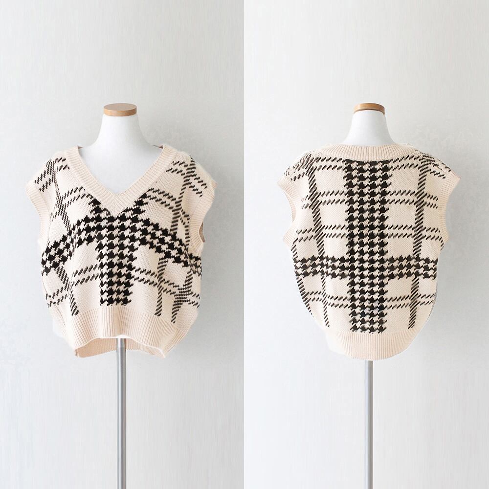 チェック柄ベスト Vネック ニットジレ ノースリーブ 秋冬 ニットトップス レイヤードベスト レトロ風