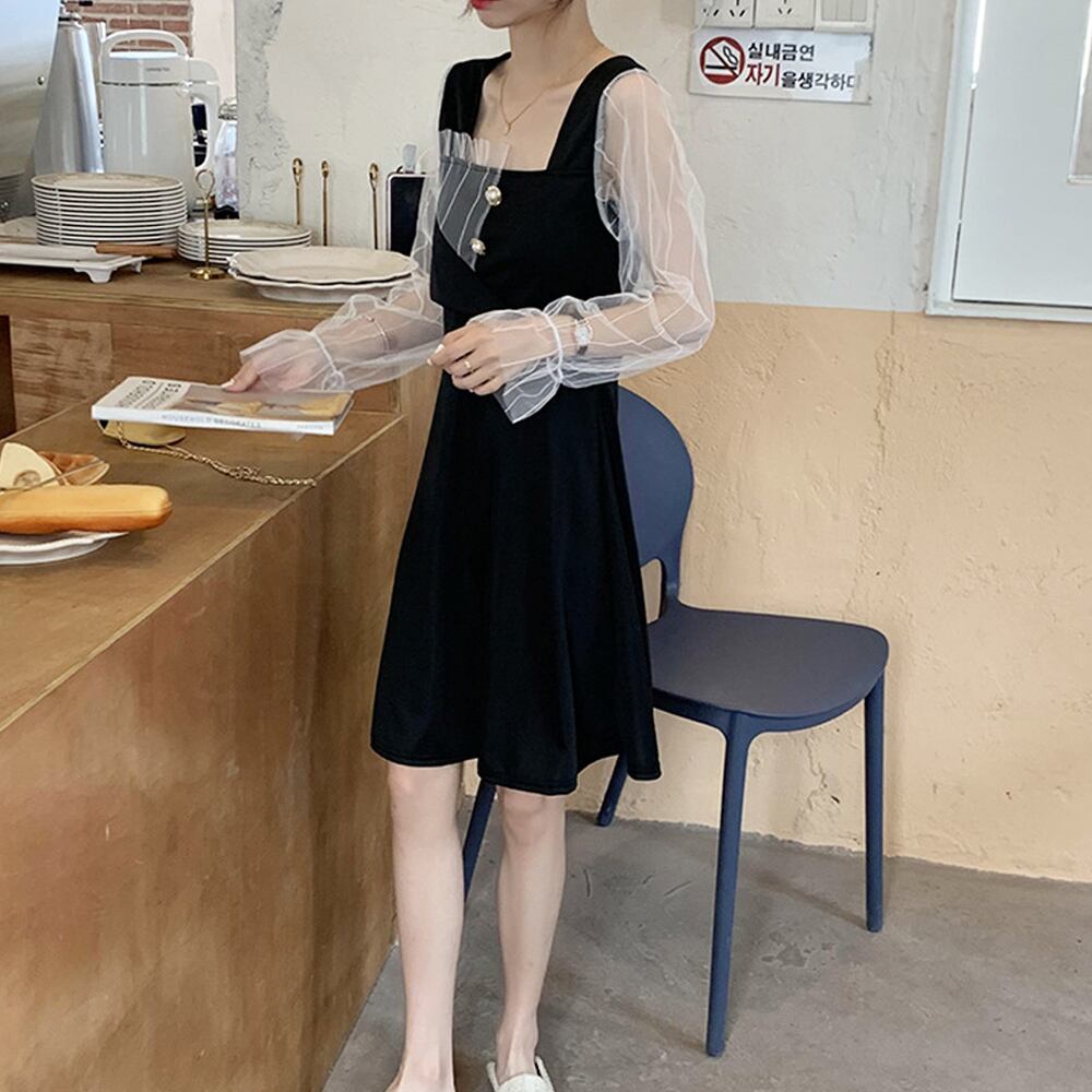 レディース Aラインワンピース 春秋夏 異素材 長袖ワンピース 新作 おしゃれ ドレス スクエアネックワンピ