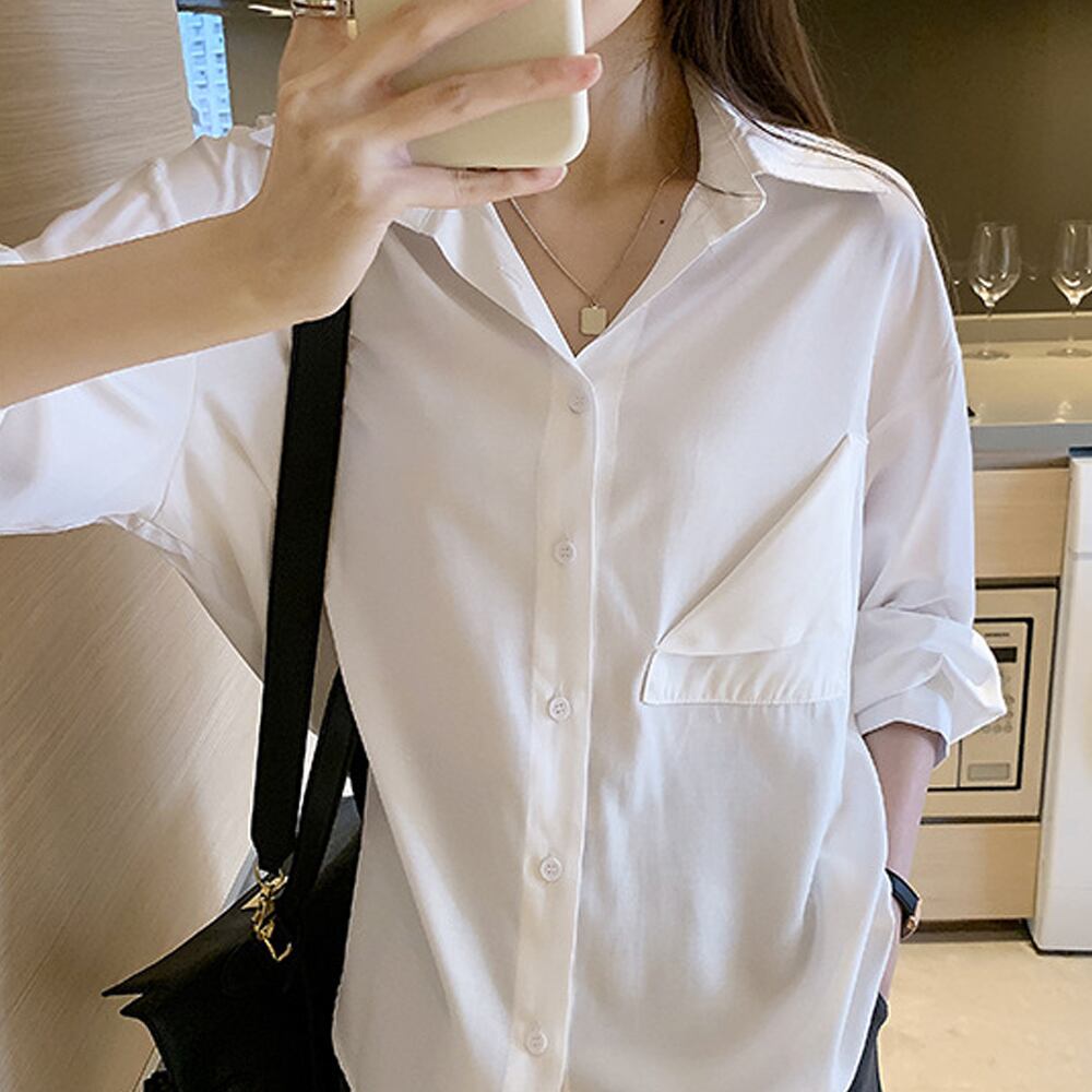 シンプルなデザインでどんなシーンでも活躍!前後の丈が違うアンバランス丈のおしゃれシャツブラウス