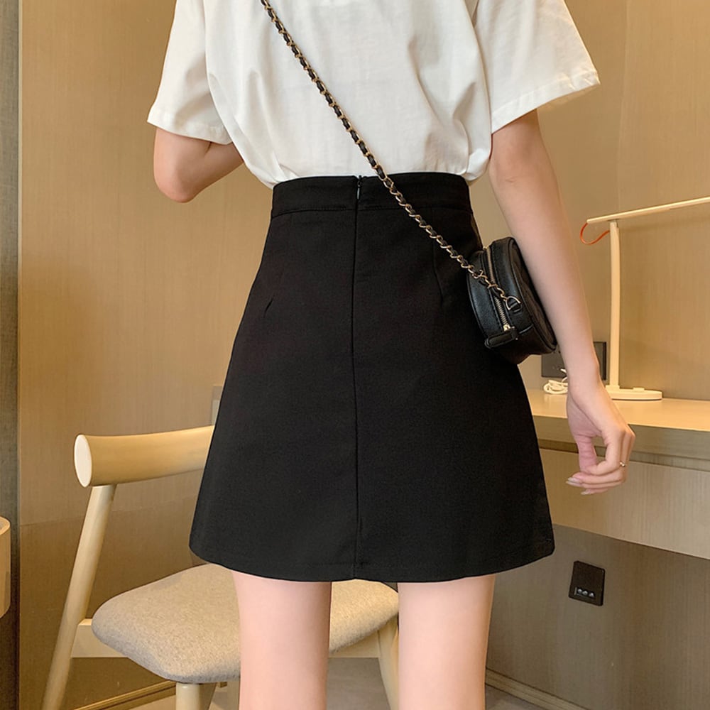 ボダン×プリーツ風がさりげないアクセントにレディな膝上丈で美脚、ハイウエストですっきりとした腰ラインを演出します。