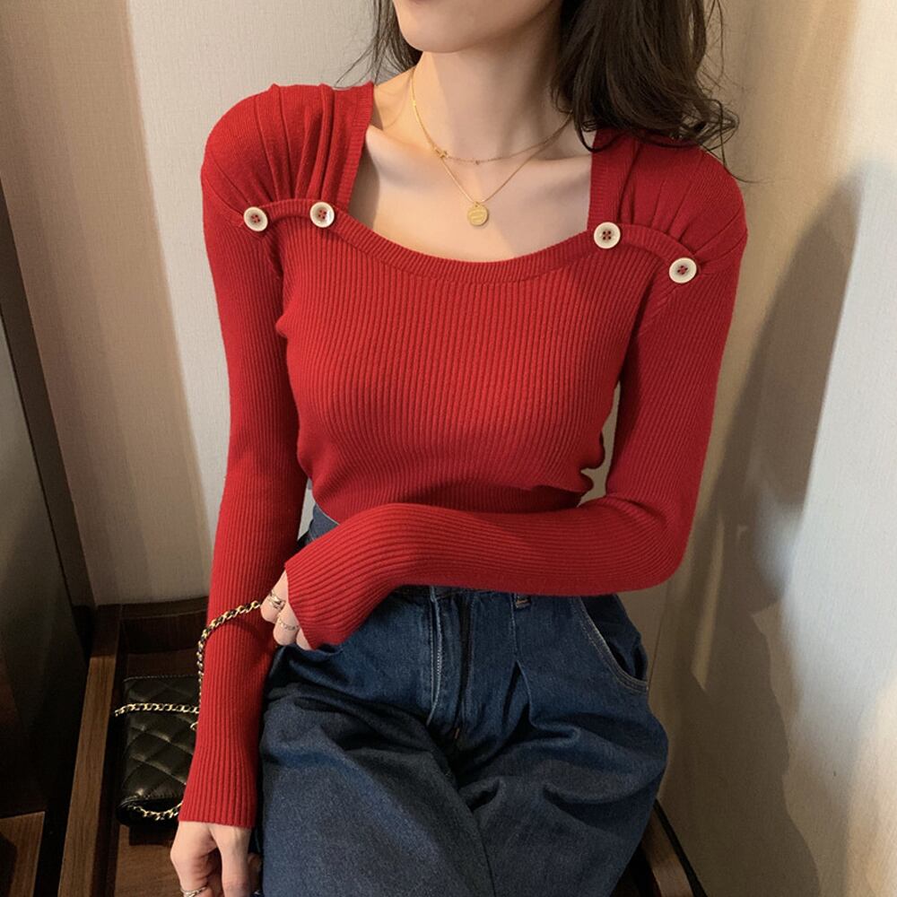 顔周りをすっきり見せてくれるスクエアネックタイプのリブニットトップス
