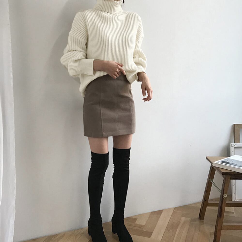 流行りのリブ仕様で仕上げたハイネックタイプのゆったり目長袖ニットセーターです
