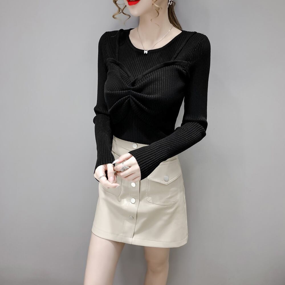 タイトトップス レディース リブニット リボン ニットソー 無地 プルオーバー ニットセーター 大人可愛い
