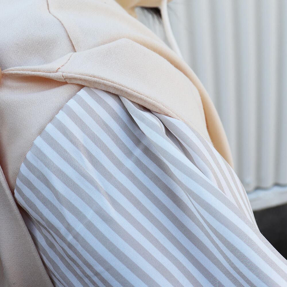 パーカーカットソーとストライプ柄のシャツを重ね着したドッキングプルオーバー