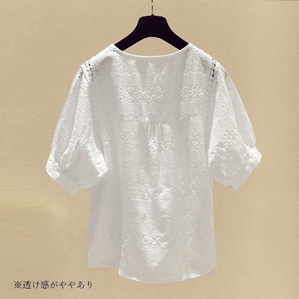 レース花刺しゅう ブラウス レディース ゆったり シャツ5分袖 クールネック