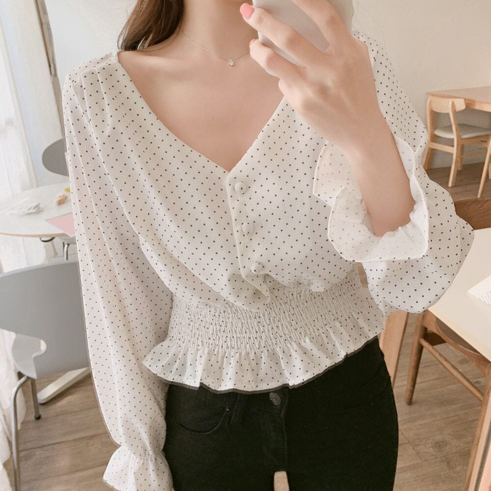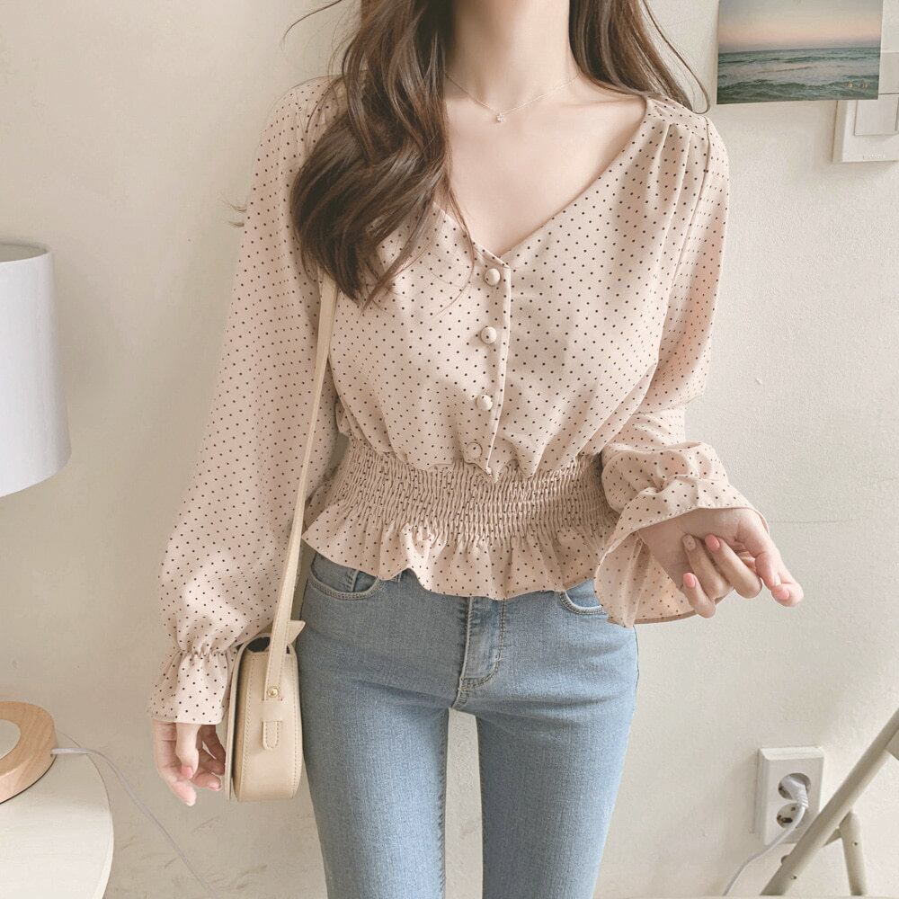 ドット柄ブラウス レディース 長袖 フリル ブラウス 春 おしゃれ 韓国風