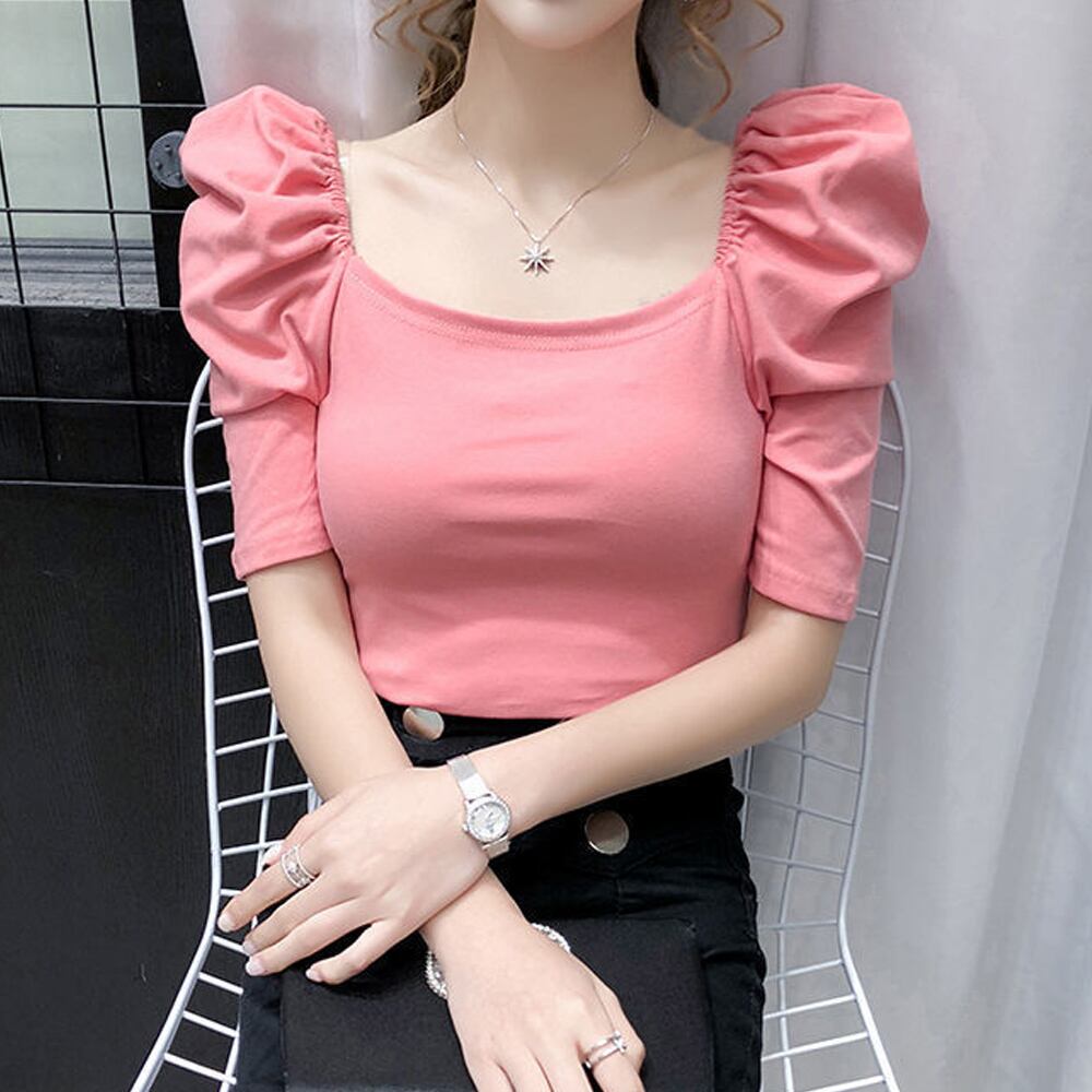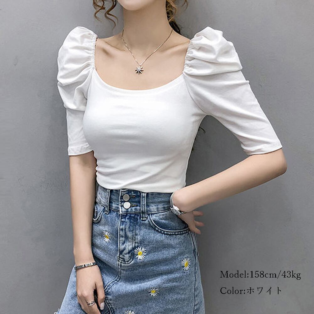 スクエアネック トップス レディース パフスリーブ 無地 カットソー 五分袖