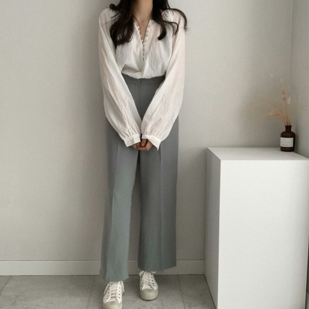程よい透け感と絞られたパフ袖口のディテールがポイント。