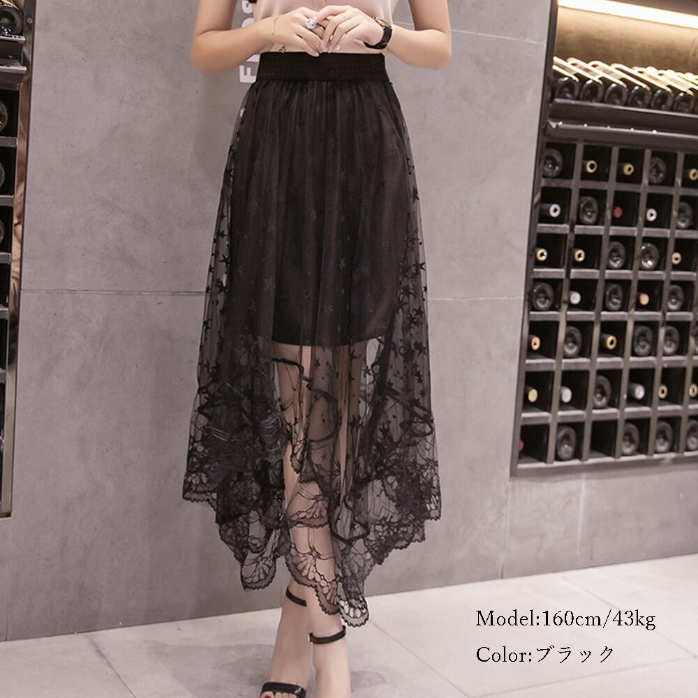 ロングスカート シアーチュール アシンメトリー ボトムス ウエストゴム 裾不規則 レース スカート ミモレ丈 春夏 透け感 スカート