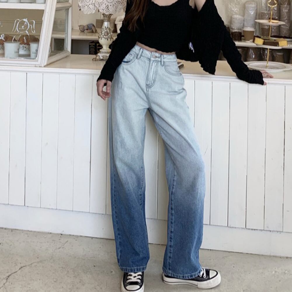 ハイウエスト グラデーションカラー デニムワイドパンツ カジュアル 韓国ファッション デニム ジーンズ ロング パンツ 体型カバージーパン