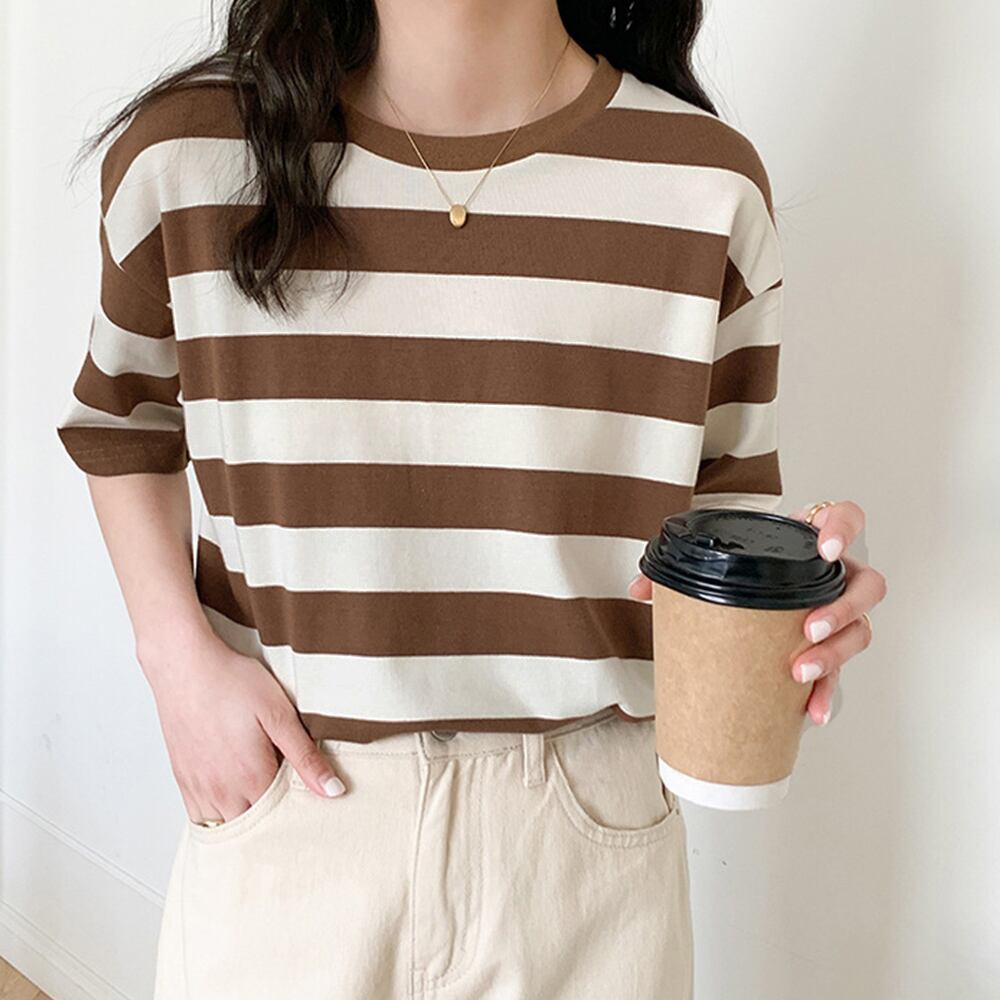 夏服トップス薄手 太ボーダートップス tシャツ ゆったり