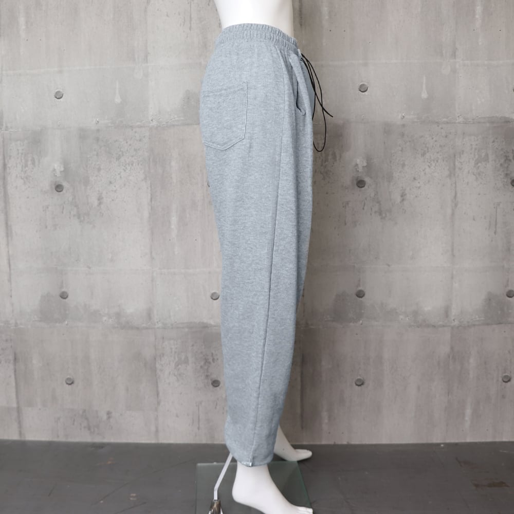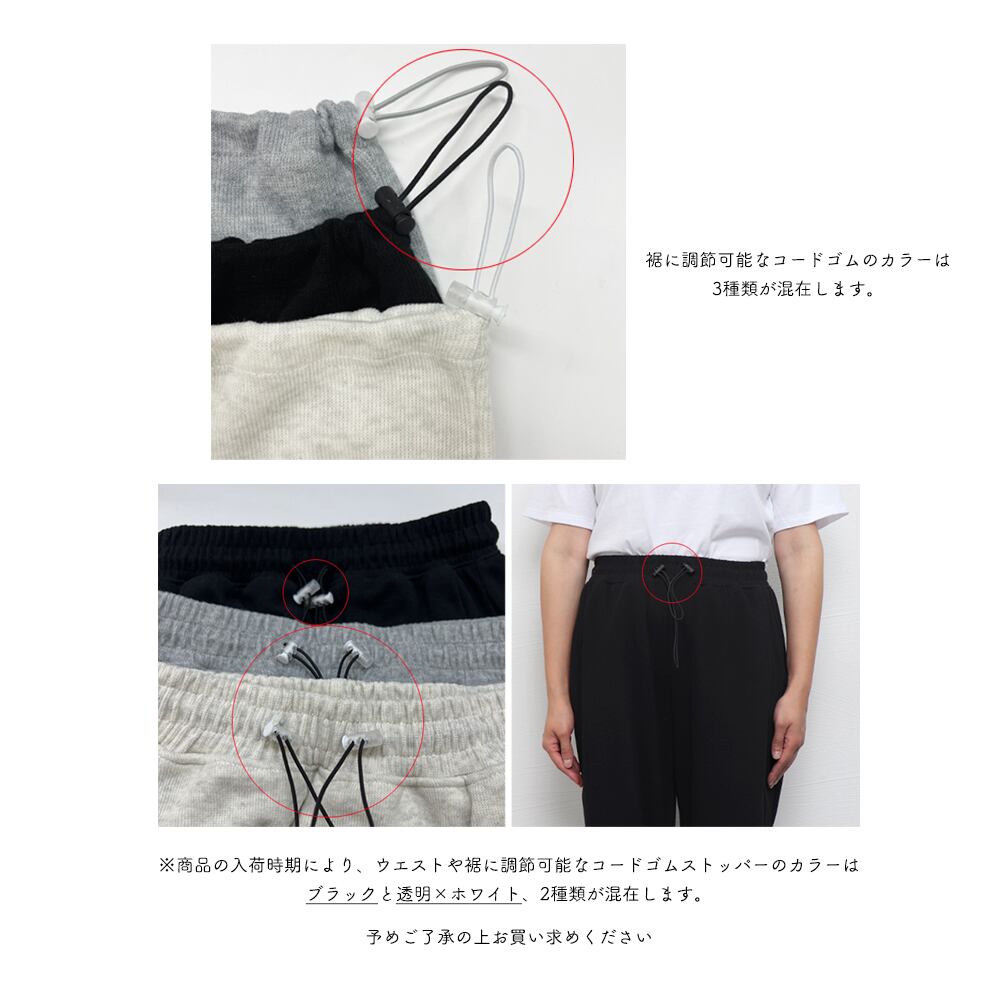 ウエストゴムと裾は紐でサイズ調節でき、脚を長く見せる。