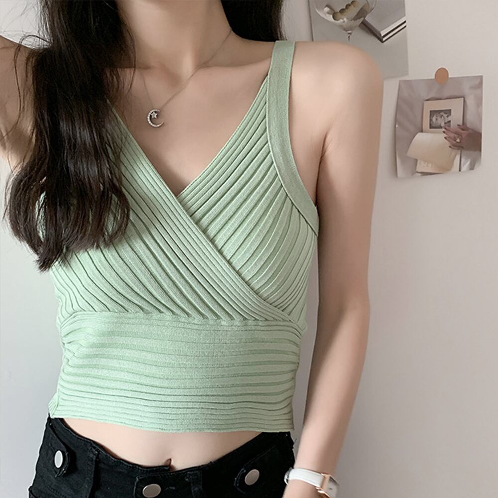 ニットの風合いがフェミニンさをアピールしてくれる、深く開いたVネックのショート丈タンクトップです