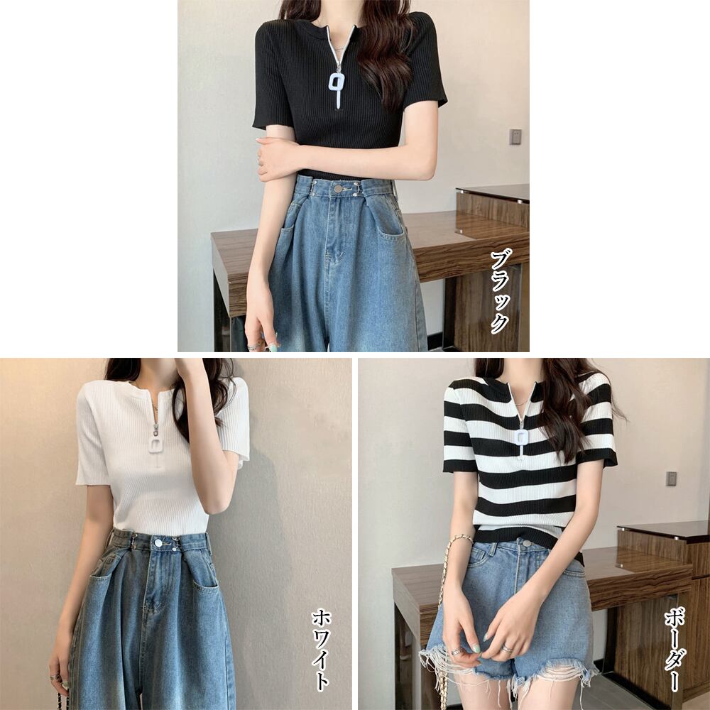 ファスナー付き 韓国風 リブニット 着やせ 半袖 ニットTシャツ シンプル カジュアルニットソー 春秋夏 トップス
