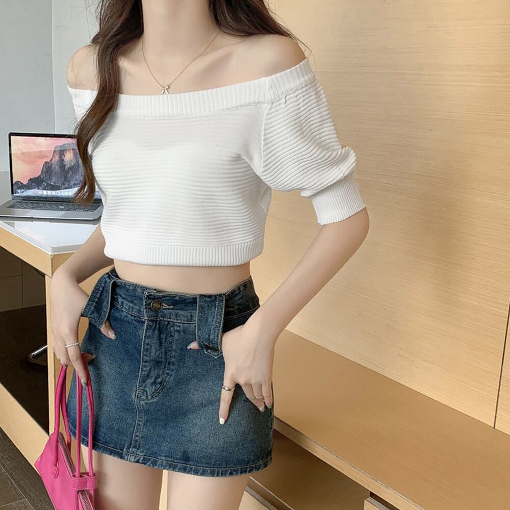 レディース 肩出し サマーニット ショート丈 リブニット セクシー 着やせ ニットソー鎖骨見せ トップス パフスリーブ