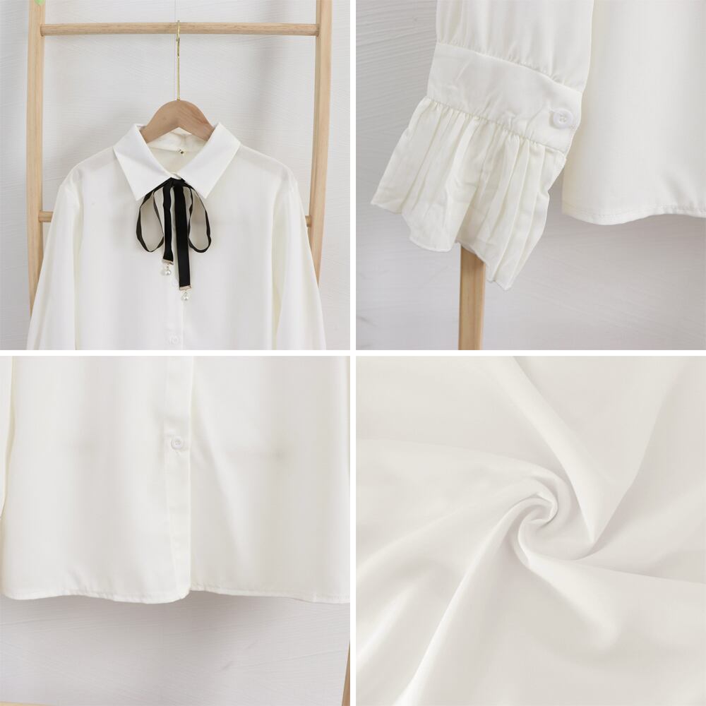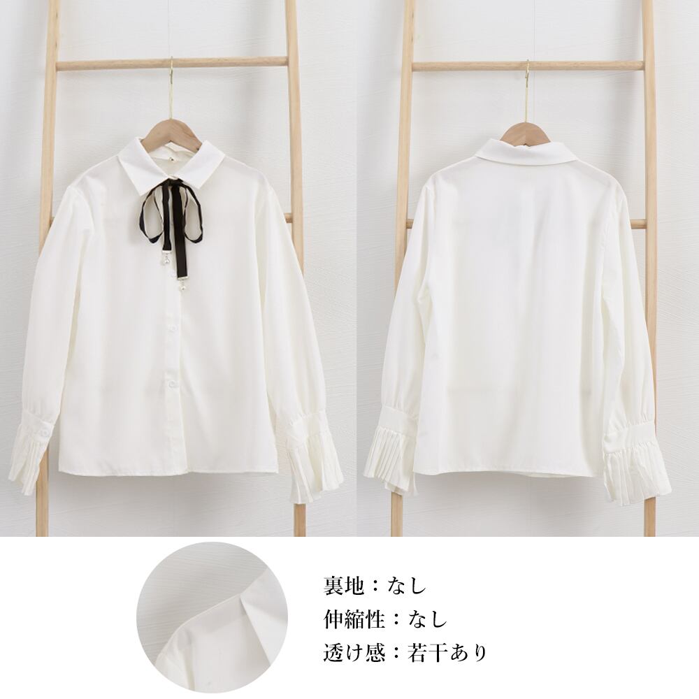 リボンタイにパールも付いていてさりげなくワンポイントアクセント、シンプルできちんと感のある仕様にプリーツフリル袖元のデザインを加えてフェミニンさをプラス