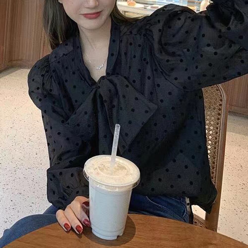 衿元のリボンと大きな袖がクラシックな可愛さを醸し出すドット柄長袖ブラウス