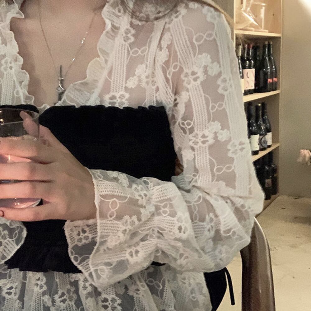 ブラウスの上にビスチェを重ね着しているように表現した花柄レースブラウス