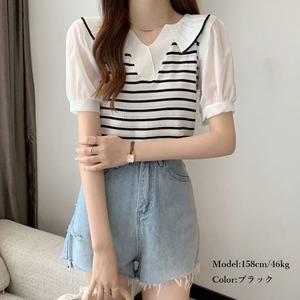 レディース Vネック 袖異素材ニットソー 襟付き カジュアル サマーセーター 韓国風 大人可愛い ドッキングブラウス
