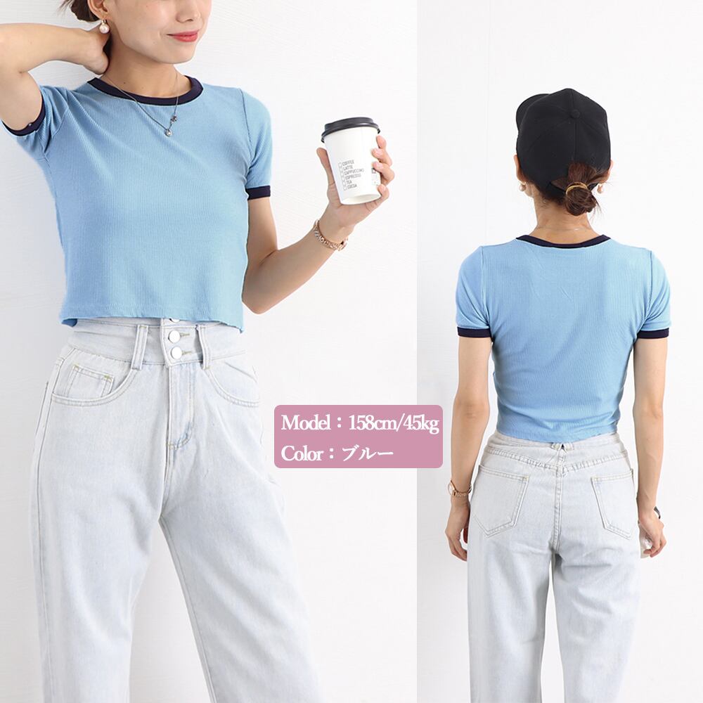 ネックと袖のバイカラーデザインはお洒落な半袖リブカットソー