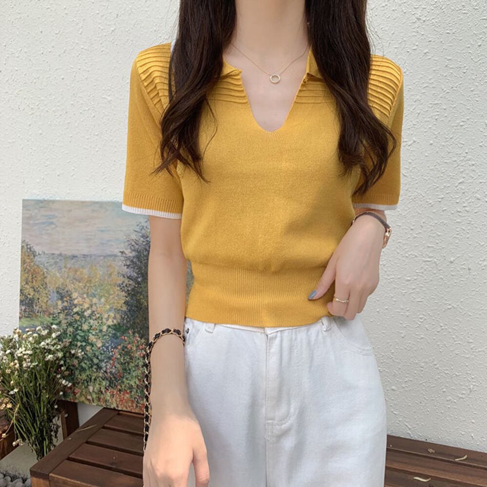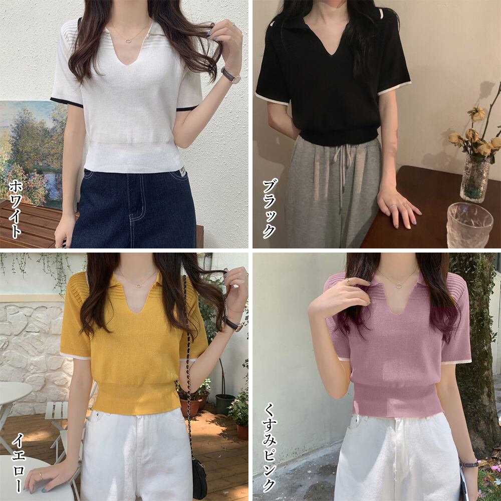ポロシャツ プルオーバー ニットトップス 大人可愛い 薄手ニット お洒落 着やせ ショート丈トップス 韓国風ニットソー