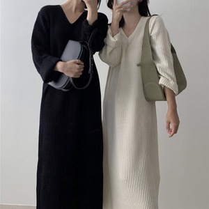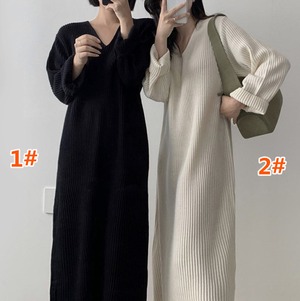 ワンピース ニットワンピ Vネック ロング丈ワンピース 韓国風 レディース服  秋冬新作 着回し