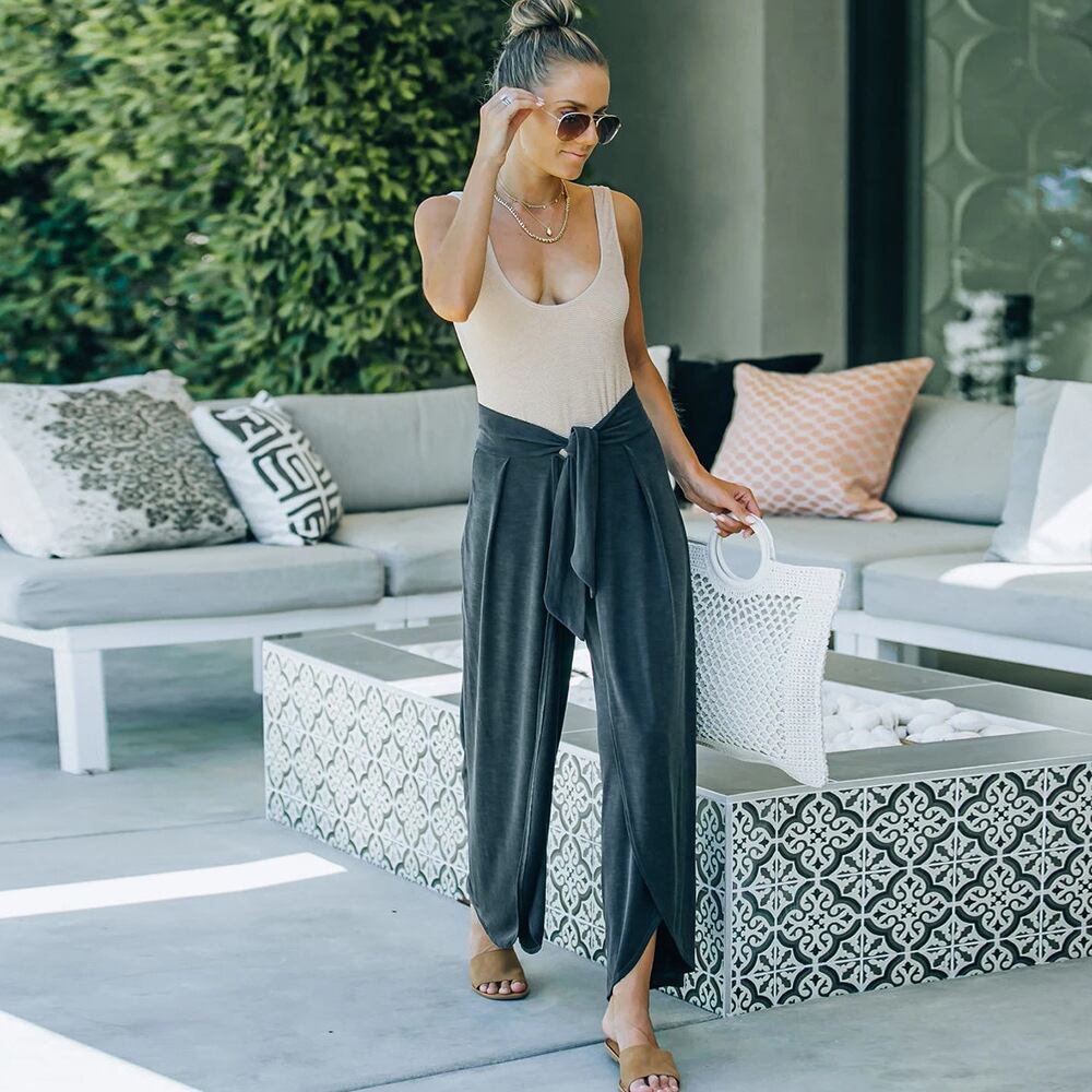 秋新作 ニットパンツ ワイドパンツ ロングパンツ スリット リボン付き レディース 着痩せ