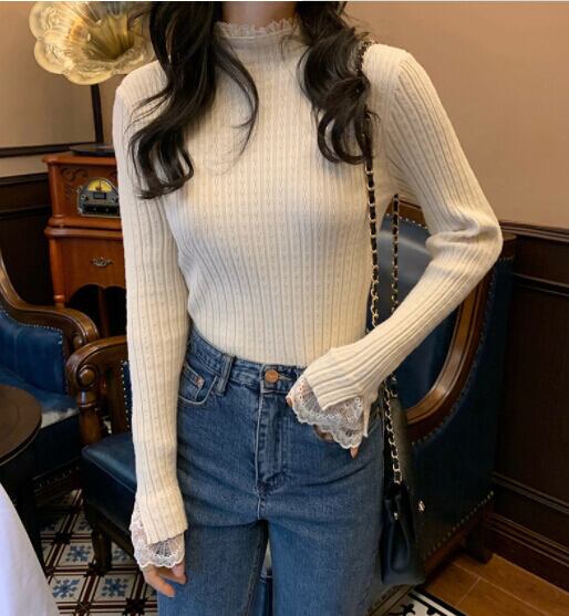春秋新作 レディース トップス ニット レース 細身 重ね着風