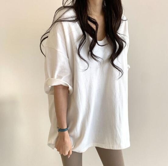 韓国風 chic トップス Tシャツ 半袖 夏ファッション スリット Vネック シンプル レディース