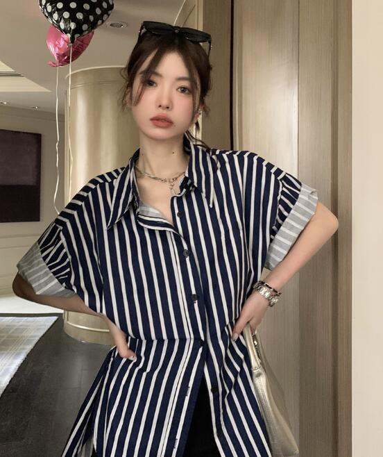新作 レディース トップス シャツ 半袖 レトロ 縦縞 カジュアル