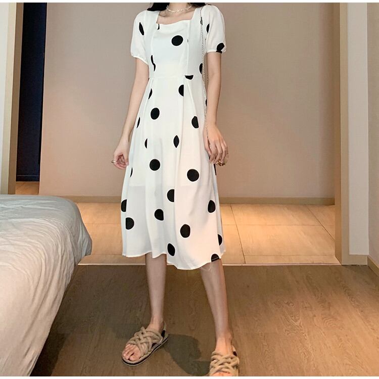 気質の女神は本当に綺麗です 通勤する ドット 半袖 スクエアネック ロングスカート 背透けて
