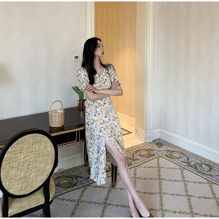 韓国ファッション Vネック スプリット セクシー 壊れた花 シフォン