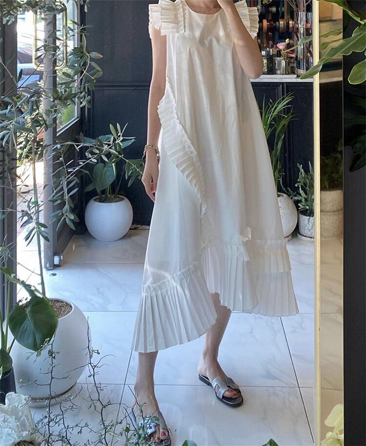 INSスタイル イレギュラー 無地 ワンピース ロングスカート 韓国 気質 デザインセンス プリーツ
