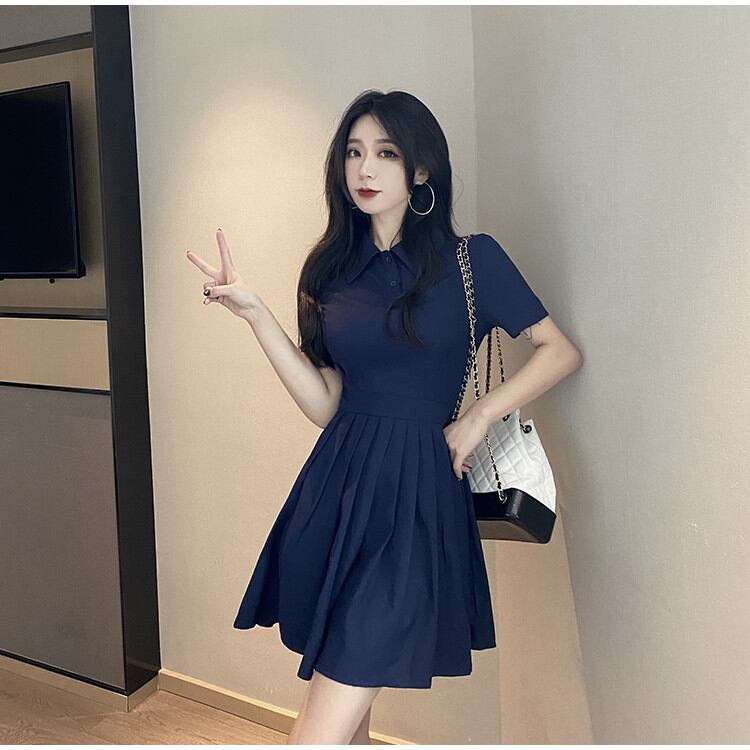 【季節にピッタリ!】 夏 フレンチ ワンビース 中・長セクション ヘップバーン風 ポロ襟 プリーツスカート
