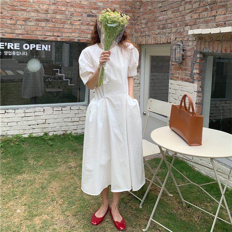 韓国ファッション ホワイト ワンビース ウエスト ポケット半袖 気質 ロングスカート ゆったりする